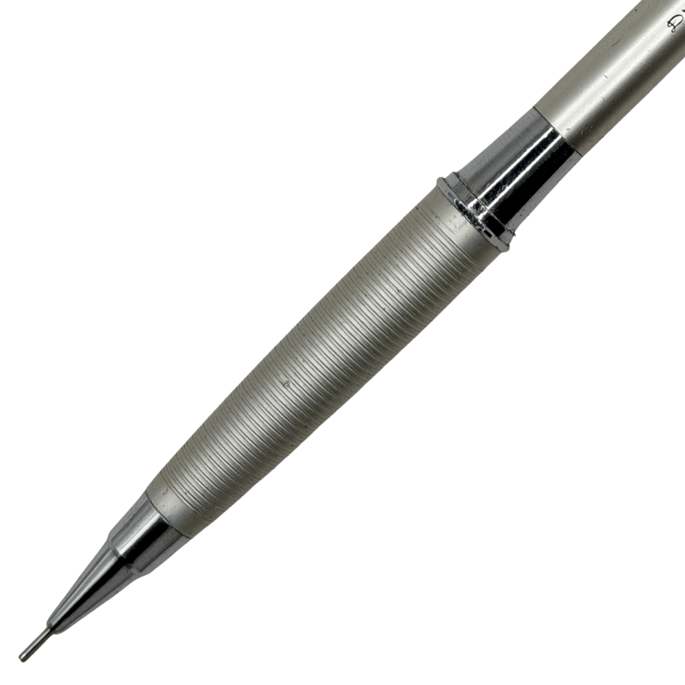 Uç kalınlığı: 0.5mm · Mekanizma: Üstten basma ile uç ilerleme · Gövde: Full metal (alüminyum + krom aksanlar) · Kavrama: Yivli metal (ribbed grip) · Uç tipi: 4mm sabit metal kılıf (fixed sleeve) · Üretim: Japonya · Durum: Vintage, üretimden kalkmış